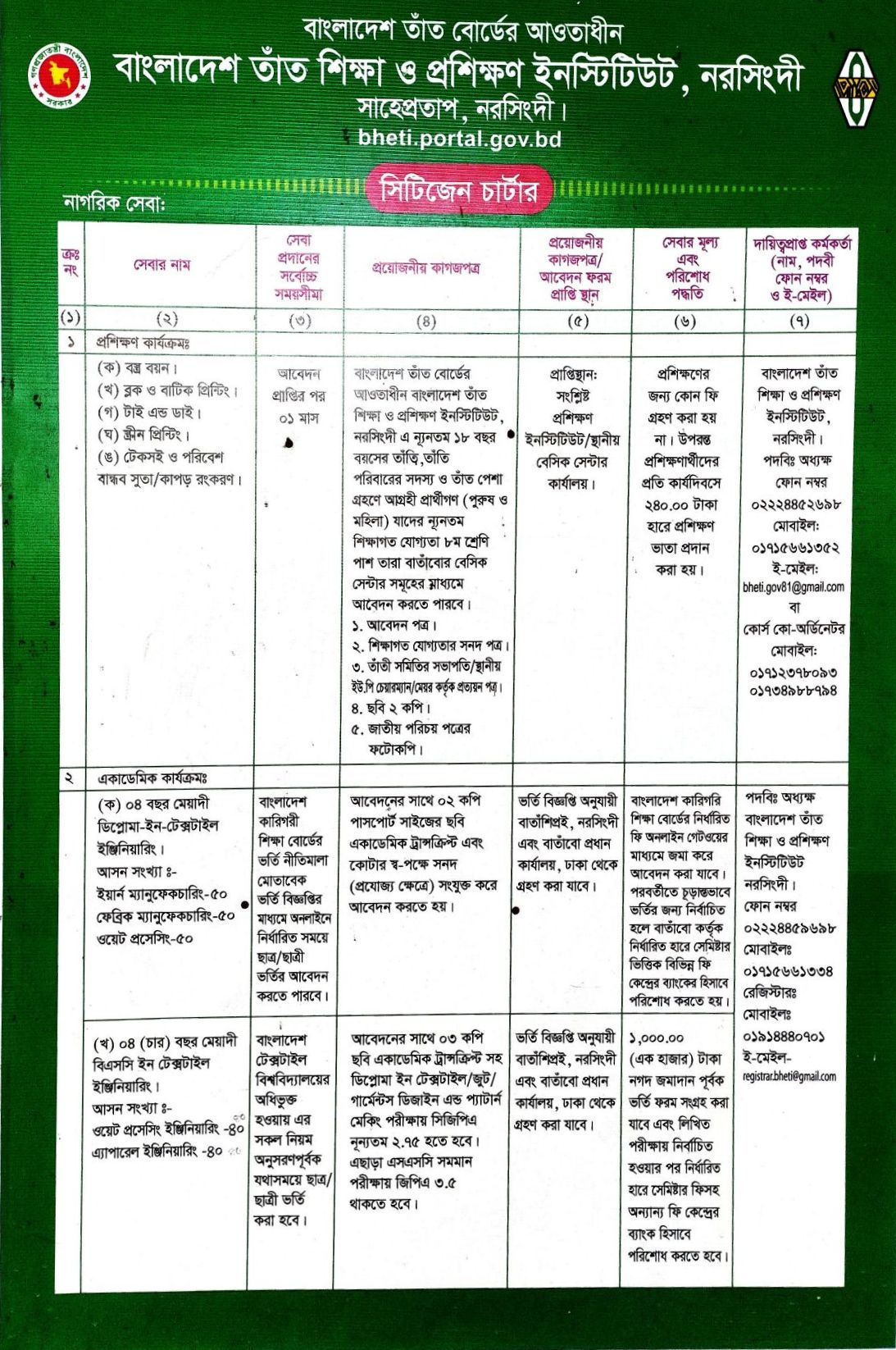 | (ক) ০৪ বছর মেয়াদী ডিপ্লোমা-ইন-টেক্সটাইল ইঞ্জিনিয়ারিং। আসন সংখ্যাঃ- ইয়ার্ন ম্যানুফেকচারিং-৫০ ফেব্রিক ম্যানুফেকচারিং-৫০ ওয়েট প্রসেসিং-৫০ | বাংলাদেশ কারিগরী শিক্ষা বোর্ডের ভর্তি নীতিমালা মোতাবেক ভর্তি বিজ্ঞপ্তির মাধ্যমে অনলাইনে নির্ধারিত সময়ে ছাত্র/ছাত্রী ভর্তির আবেদন করতে পারবে। | আবেদনের সাথে ০২ কপি পাসপোর্ট সাইজের ছবি একাডেমিক ট্রান্সক্রিপ্ট এবং কোটা স্ব-পক্ষে সনদ (প্রযোজ্য ক্ষেত্রে) সংযুক্ত করে আবেদন করতে হবে। | ভর্তি বিজ্ঞপ্তি অনুযায়ী বাতাঁশিপ্রই, নরসিংদী এবং বাতাঁবো প্রধান কার্যালয়, ঢাকা থেকে গ্রহণ করা যাবে। | বাংলাদেশ করিগরি শিক্ষা বোর্ডের নির্ধারিত ফি অনলাইন গেটওয়ের মাধ্যমে জমা করে আবেদন করা যাবে। পরবর্তীতে চূড়ান্তভাবে ভর্তির জন্য নির্বাচিত হলে বাতাঁবো কর্তৃক নির্ধারিত হারে সেমিষ্টার ভিত্তিক বিভিন্ন ফি কেন্দ্রের ব্যাংকের হিসাবে পরিশোধ করতে হয়। | বাংলাদেশ তাঁত শিক্ষা ও প্রশিক্ষণ ইনিস্টিটিউট, নরসিংদী। পদবিঃ অধ্যক্ষ ফোন নম্বর ০২২২৪৪৫২৬৯৮ মোবাইল: ০১৭১১-৪৮২৯৬৪ ডিপ্লোমা-ইন-টেক্সটাইলঃ- একাডেমিক ইন চার্জঃ- মোবাইল: ০১৭১৫-৬৬১৩৫২ বিএসসি ইন টেক্সটাইলঃ- রেজিস্ট্রার- মোবাইলঃ০১৫৫৮-৯৪৮৬৬৪ ই-মেইল registrar.bheti@gmail.com ওয়েবসাইট: